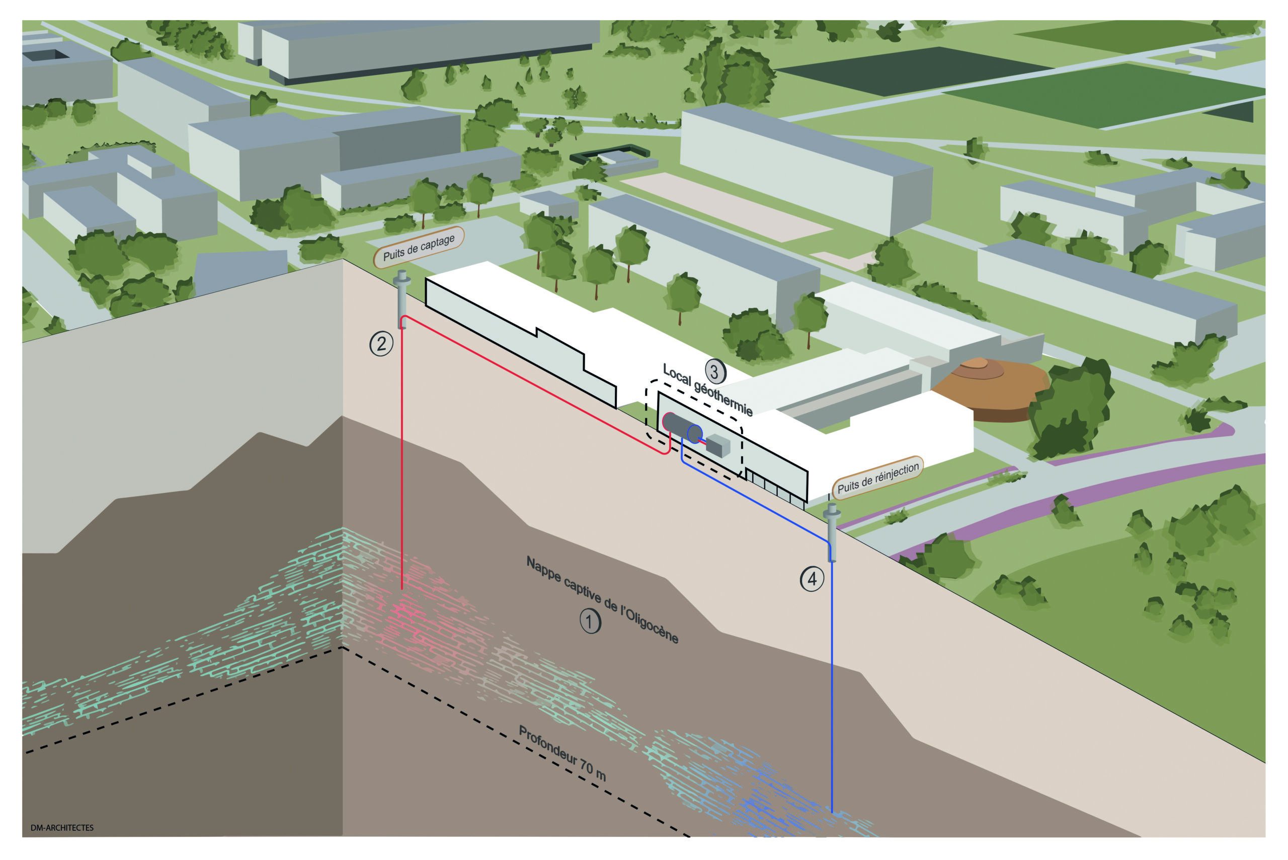 Entre autres contraintes, ce projet prévoit d’utiliser le potentiel géothermique du sous-sol en créant un doublet géothermique réversible (bulle froide en hiver et bulle chaude en été, stables d’une saison à l’autre).