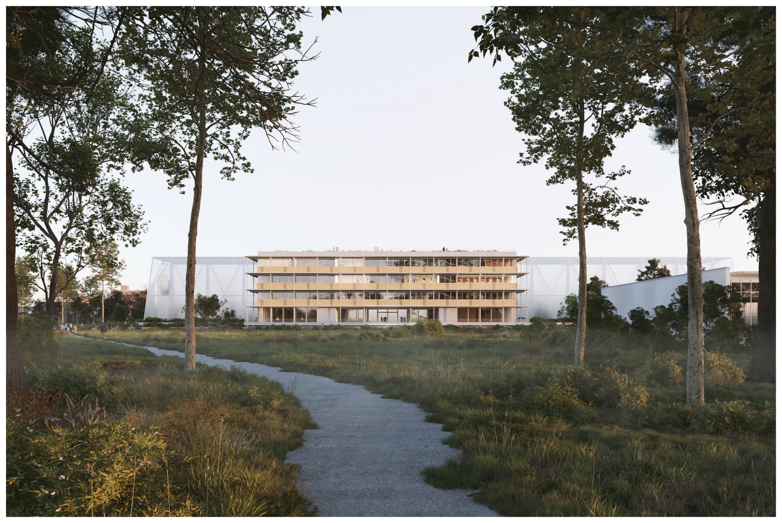 - Le bâtiment de bureaux/ ateliers sera constitué d’un socle béton surmonté d’un bâtiment en ossature mixte bois béton avec une façade à ossature bois