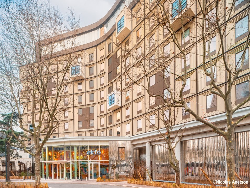 Une canopée architecturale, qui poursuit celle des arbres du jardin, recouvre le site. La matérialité d’ensemble est un composite en verre avec des éléments transparents, translucides ou opaques selon les usages qu’ils abritent.